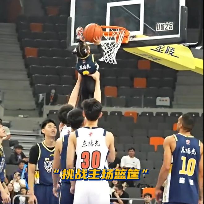 面对场上5名广东队球员组成的“防守阵容”,这位小女孩毫不怯场,在球员张昊的默契配合与托举下,成功完成一记扣篮。