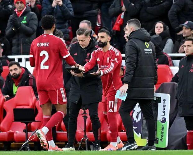 上一场与国米的欧冠比赛,萨拉赫被队内禁赛一场。这场面对布莱顿,萨拉赫先坐板凳,右边锋位置由本赛季数据亮眼的索博斯洛伊占据。但戈麦斯意外受伤,斯洛特不得不提前派遣萨拉赫出场,索博回撤右后卫,埃及人回到熟悉的右翼,埃基蒂克居中,维尔茨在另一侧。